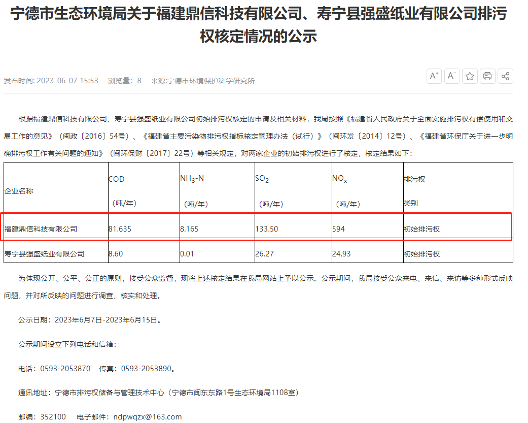 6月7日,寧德市生態(tài)環(huán)境局就福建鼎信科技有限公司排污權(quán)核定情況對(duì)外進(jìn)行公示, 公示日期:2023年6月7日-2023年6月15日。