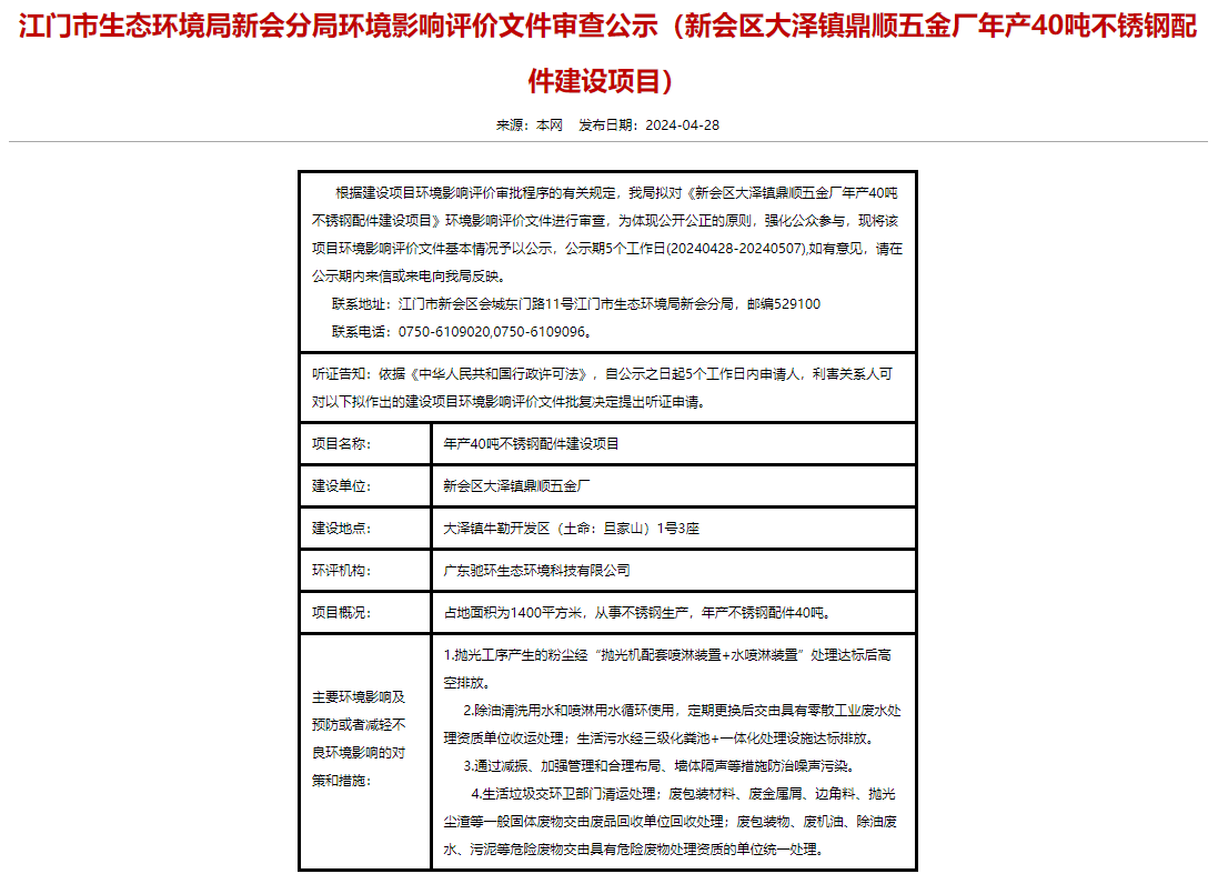 4月28日,江門市生態(tài)環(huán)境局新會分局就新會區(qū)大澤鎮(zhèn)鼎順五金廠年產(chǎn)40噸不銹鋼配件建設(shè)項目環(huán)境影響評價文件進行審查公示,公示期5個工作日(20240428-20240507)。