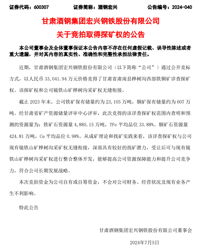7月5日,據(jù)酒鋼宏興公告稱,公司近期通過公開競標方式,以人民幣 33,041.94 萬元價格競得了甘肅省肅南縣樺樹溝西部鐵銅礦詳查探礦權。