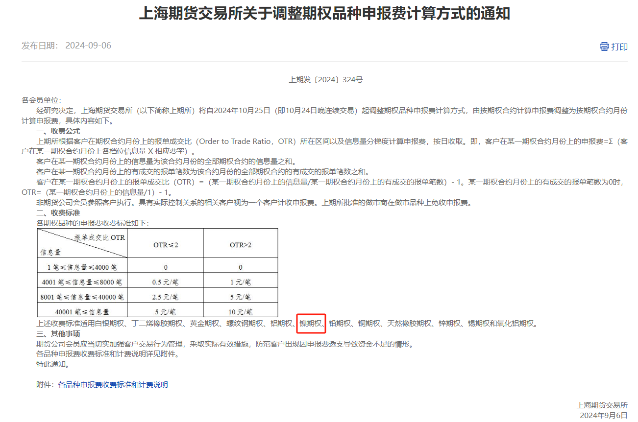 據(jù)顯示,鎳期權(quán)申報(bào)費(fèi)將自2024年10月25日(即10月24日晚連續(xù)交易)起調(diào)整。