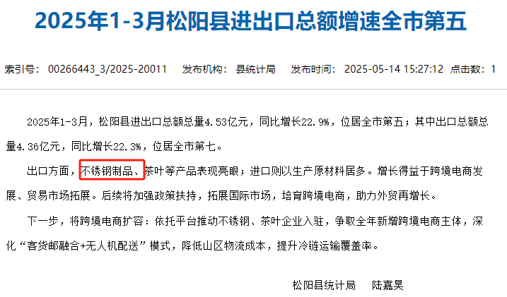 2025年5月14日,松陽(yáng)縣統(tǒng)計(jì)局發(fā)布一文《2025年1-3月松陽(yáng)縣進(jìn)出口總額增速全市第五》。