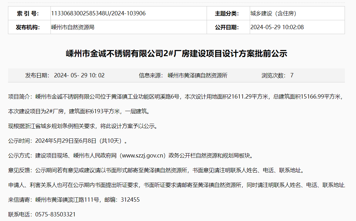 5月29日,嵊州市黃澤鎮(zhèn)自然資源所就嵊州市金誠(chéng)不銹鋼有限公司2#廠房建設(shè)項(xiàng)目設(shè)計(jì)方案對(duì)外進(jìn)行批前公示,公示時(shí)間:2024年5月29日至6月8日(共10天)。