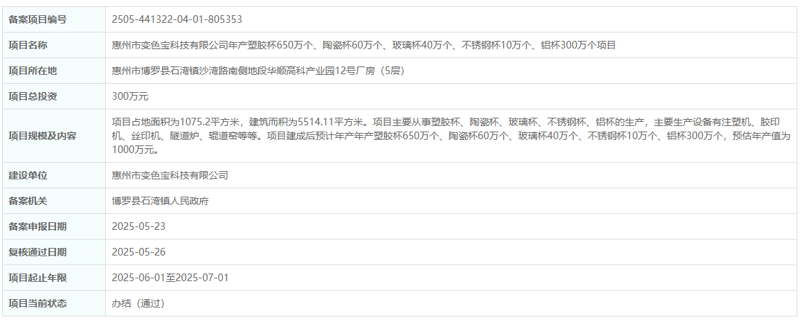 2025年5月26日,惠州市變色寶科技有限公司年產(chǎn)塑膠杯650萬個、陶瓷杯60萬個、玻璃杯40萬個、不銹鋼杯10萬個、鋁杯300萬個項目備案復(fù)核獲通過。